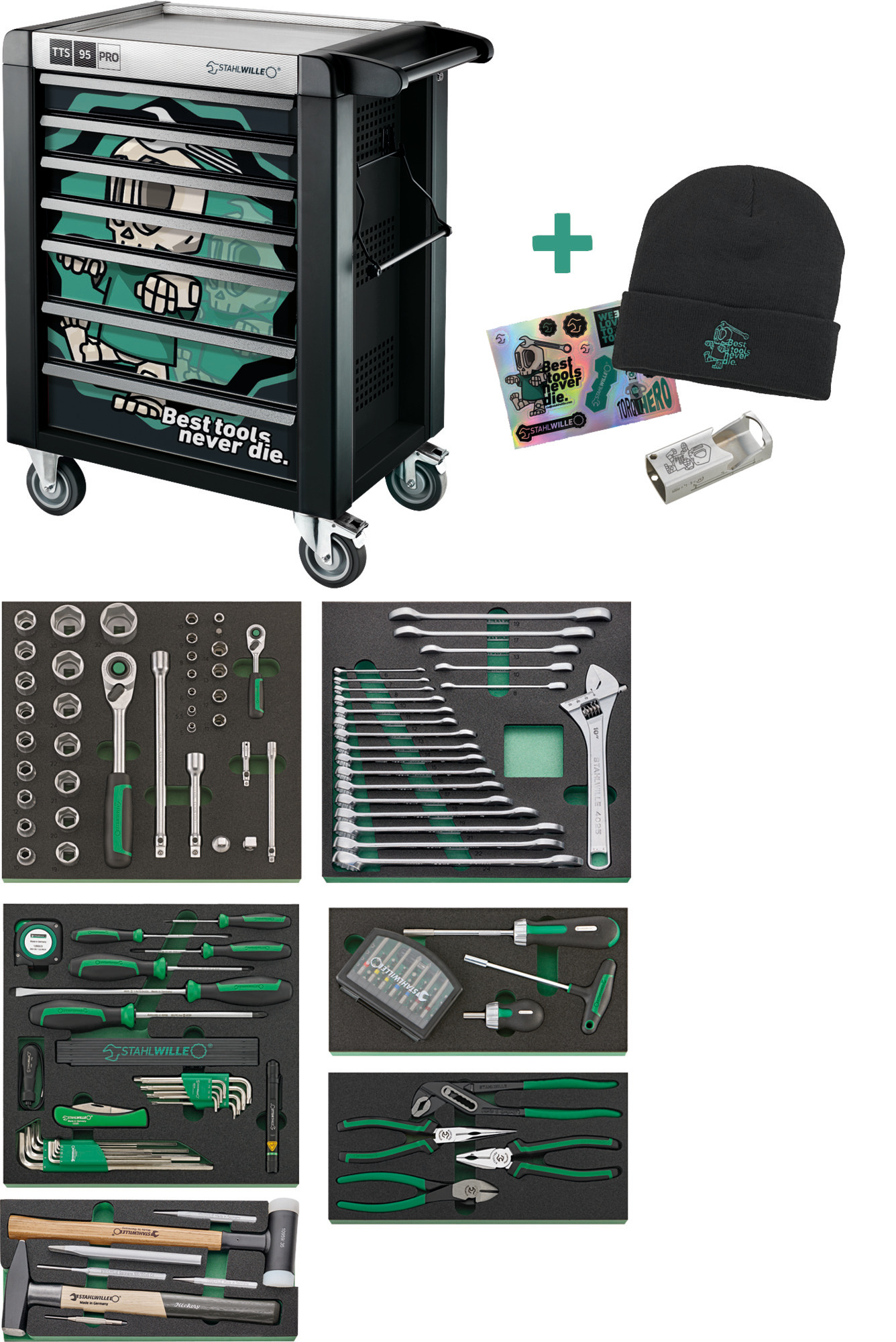 Robuster Werkzeugwagen mit sieben Schubladen, exklusiver UV-Lackierung im Sonderdesign «Best tools never die» und einem 157-teiligen Werkzeugsortiment.